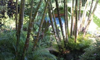 The one-bedroom downstairs apartment looks out lush tropical garden, orchids, anthuriums and lush tropical plants.