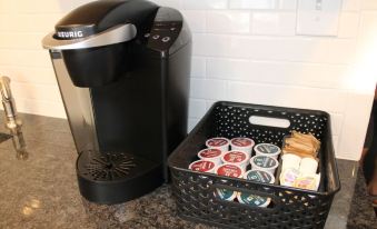 Completely updated kitchen provides all of the essentials including fridge, stove, and microwave. Keurig coffee maker along with complimentary coffee is provided.