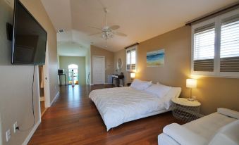 The Master Bedroom is all by itself on the top floor. It has a king size bed (sleeps 2), and a 14”-tall twin-size futon sofa, that can be lay flat as a small bed (33”x66”x14”H, good for a person under 5’5”). The room also has a baby crib which comes with changing stations and drawers. Its master bath has a standing shower and a 1-person indoor jacuzzi. Master Bedroom has a private screen patio, that over looks the Gulf and the pool