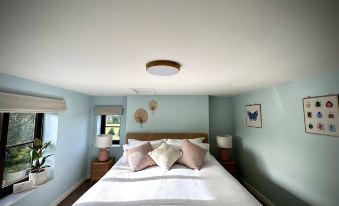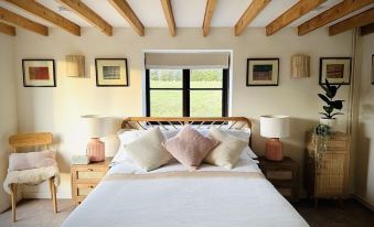 This tranquil space enjoys views of the climbing roses and mature flower beds, and has an extremely comfortable super king size bed with luxury deep filled mattress and super king sized pillows and bed throws. A wide screen TV is included with all the streaming channels as well as a beautiful midcentury styled rattan armchair with sheepskin cushion and velvet cushions.