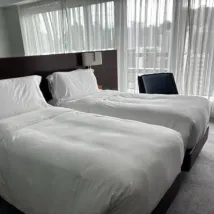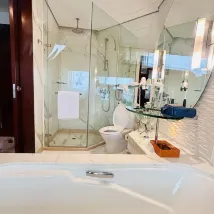 Leider gab es in der Hotellobby kaum Sitzgelegenheiten, sodass Gäste sich nicht kurz ausruhen konnten und stehen mussten. Das Standard-Superior-Zimmer war weder besonders geräumig noch zu klein. Was ich persönlich nicht mochte, war, dass man zum Duschen in die Badewanne steigen musste. Das Badezimmer war hauptsächlich mit transparentem Glas und in Weiß gehalten, was zwar sehr schick aussah, aber in der Praxis eher unpraktisch war. Das Toilettenpapier befand sich unten links neben der Toilette, und da der Platz beengt war, war es sehr umständlich, es zu erreichen. Das Waschbecken aus Glas spritzte leicht, und das Bett war zu weich.