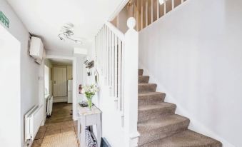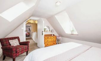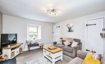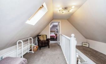 The cottage features a fully equipped modern kitchen with a dining table for four. The espresso machine takes Dolce Gusto pods. On the ground floor, you’ll find a bathroom with a shower over the bath and a cosy living room with a wood-burning stove for guests to enjoy. Upstairs are two bedrooms: one with a king bed and the other with two singles. There’s a single parking space behind the property. At the front, a small garden with a table and four chairs is perfect for relaxing on a sunny day.