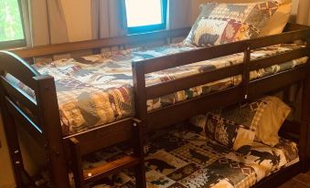This spacious cabin has a open layout for the kitchen, dining room and living room. The roomy, bedroom loft is located upstairs and has two comfortable, queen sized beds. The cabin also has a couch and a set of twin bunk beds that help it sleep seven comfortably. Refrigerator, stove, microwave, coffee maker and blender are just a few of the amenities included in the kitchen. The dining area includes a small bar and a dining table. There is a washer and dryer in the laundry area.