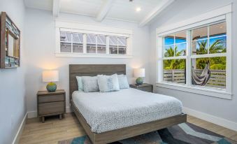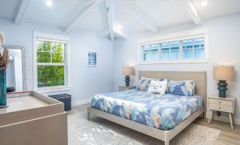 Our newly constructed two-story house has 3 spacious bedrooms, a study area with bunk beds, plus 3 and a half bathrooms, to comfortably accommodate up to 6 adults plus children. The bright living area fully opens up to a private patio, where you'll love to gather by the heated plunge pool with a view of the sunset over the bay.