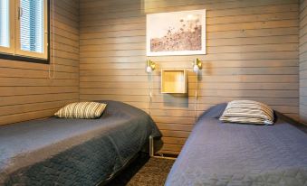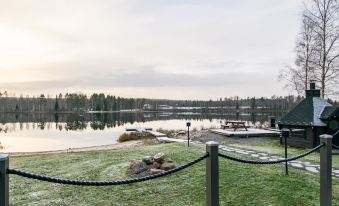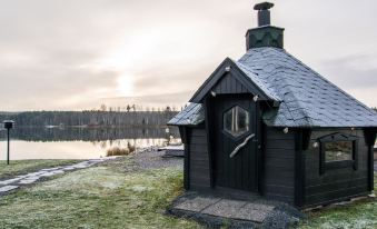 A stylishly decorated cabin on a spacious plot. From the cabin’s terrace and the wood-heated hot tub, you can enjoy beautiful lake views. There is a separate lakeside sauna and a grill hut by the shore. The property includes a private pier and a rowing boat. A canoe and a SUP board are also available for guests.