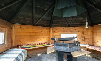 The wooden cabin, built in 1996, was elegantly renovated in 2022. It features a well-equipped living room/kitchen, a spacious dining room, and a living area with a sofa set and a heat-storing fireplace. The living area also has an air-source heat pump for cooling and heating.