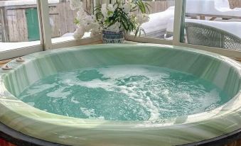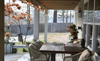 A new gas heater in the front entrance dries your gear and keeps the house comfortable. The first floor has an open layout with a fully equipped kitchen. It features a farmhouse sink, gas stove, fridge, and utensils. The living room has lots of windows, a gas fireplace, and a 46" smart TV. The dining area has large windows and sliding doors that open to the covered back porch. Inside, there is a dining room with a table for 8 people. An indoor hot tub room overlooks the gardens and fits 5 adults comfortably. There is also a bedroom with a queen size bed. All beds are extremely comfortable with high quality sheets and pillows.