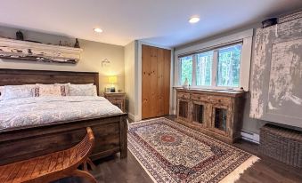 Upstairs is a big master bedroom with a king size Tempurpedic mattress, as well as a new master bathroom with heated floors and two rainshower heads. The master bedroom also has sliding doors that open to a deck with outdoor seating and views of Jay Peak and the mountains. Another living room is upstairs with a large couch that turns into a queen bed for extra sleeping space. There is also a second office desk with sliding doors to the upstairs deck. This living room has a pellet stove that keeps the upstairs warm in the winter. It is a great space for families with children, someone who wants some quiet time, or as a second office for people working from home. Upstairs there are two more bedrooms with queen beds on custom barn wood bed frames. One room has sliding doors to the deck and the other has large windows overlooking the gardens, sandbox, and playhouse on over an acre of land.