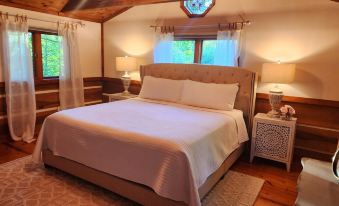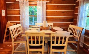 A large refrigerator, four burner stove and oven. Dining set and silverware for up to twelve guests. All the cookware needed to prepare family meals and BBQ's . Two living spaces on the main level, one with a television and the other with a fireplace. Attached indoor jacuzzi room and screened porch. Stocked and modern bathrooms. Our cabin has two-bedrooms up stairs, and two-open concept bedrooms in the basement that can comfortably host eight guests. With room to accommodate up to ten with additional fees. Perfect for the whole family or just honeymooners. Engaging outdoor lounge areas. A large porch for family gatherings. Picnic pavilion for small group events. Includes Wifi and alarm system for protection and easy access.