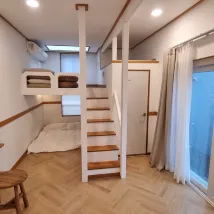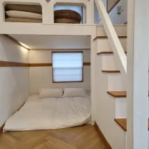 거실 안쪽에 침구가 깔려있는 침실공간이 있다. 허리를 살짝 굽히고 들어가야 하지만