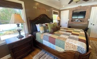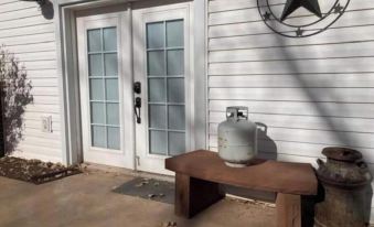 Double French doors open up to the backyard. The large, completely open floor plan is the ideal place to host gatherings and large events. The living room has a couch and two chairs, along with a large TV. There's a full-size Murphy bed cleverly tucked away in the closet and a queen sofa bed in the main room. The jaw-dropping barn wood kitchen will wow you with its huge bar complete with 6 bar stools to sit and enjoy an ice-cold drink with dinner. The fully equipped kitchen comes with a commercial sink, stovetop, fridge, microwave, toaster oven, pizza pan, baking dish, cookie sheets, pots and pans. For a small fee, use the flattop grill. There's also a washer & dryer and a full bathroom with a walk-in shower and barn wood vanity, continuing the rustic theme.