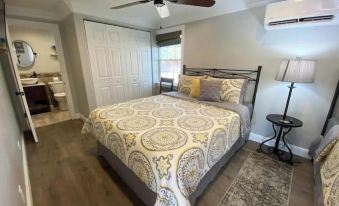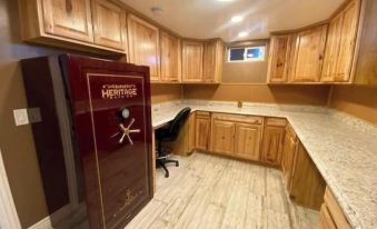The downstairs guest bedroom has a queen bed and its own private kitchenette complete with mini fridge, microwave, sink and barstool. This bedroom also has its own TV, dresser, and double closets, making for the perfect private getaway.