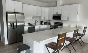 The living room is equipped with a high-definition flat screen, and allows you to enjoy the company of family and guests, as well as high speed internet throughout – perfect for remote work or streaming content. The Master Bedroom also has a TV in the room.