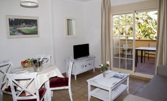 VISTAREAL HOTEL APARTAMENTOS offers visitors a perfect mix between beach and sport. The beach is only 550 m from the holiday complex. The hotel enjoys a quiet and peaceful location, surrounded by a golf course within the prestigious private urbanization of Alcaidesa. The complex consists of 2 modern design buildings with Andalusian style. All accommodations are equipped with individual air conditioning (hot and cold) in all rooms, for each bedroom a full bathroom, fitted wardrobes, kitchen (with ceramic hobs, microwave, refrigerator, and all necessary utensils, crockery and cutlery) , wifi internet connection, tv, hair dryer and electronic safe. The leisure areas include 2 swimming pools (one for adults and one for children), garden areas with sun loungers and free parking for cars.