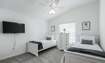 The master bedroom offers a king-size bed, Smart TV, and a relaxing sitting area, creating a private retreat within the villa. The master bathroom features double sinks, a walk-in shower with glass doors, and a generous walk-in closet. The guest bedroom includes two twin beds and a Smart TV, providing a cozy space for your guests. A guest bathroom with a tub/shower combo is located in the hallway.
