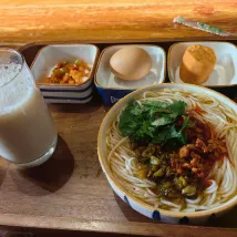 Das von der Pension bereitgestellte Teeservice war exquisit, und es gab sogar Räucherstäbchen, was eine wunderbare Atmosphäre für Tee und angeregte Gespräche schuf. Im Innenhof kann man sich auch sonnen oder lesen – ein perfekter Ort, um das entspannte Lebensgefühl von Lijiang zu genießen. Auch das Frühstück war köstlich und bot Spezialitäten aus Yunnan.