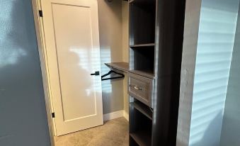 Beyond the bedroom there is a closet for hanging your clothing and storing your bags with plenty of room for his and hers. Through the door to the left there is the bathroom carefully designed with heated tile floors, large lighted mirror and glass inclosed shower/tub. Take a shower or bath and never runout of hot water with our tankless hot water heater. Pamper yourself!