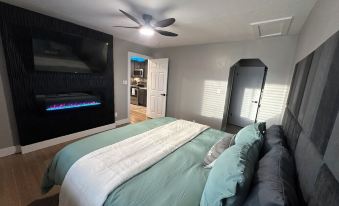 Walk into the bedroom and see a king size fully ajustable bed with a simple but elegant headboard and premium sheets, with a feather down comforter for your comfort with lux pillows. On each side of the bed you will have your own nightstand with wireless charging stations and charging ports located on the side. An added bonus is the 5ft electric fire place with led changing lights to fit your mood. And a 55’ smart fire tv above it, and a secure place to store valuables.