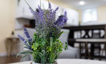 This apartment is set up to feel like a home away from home. Guests have a private entrance to the apartment on the lower level of the house. Upon entering you'll find a beautiful and spacious kitchen with ample quartz countertop space, new appliances (a full-sized refrigerator, stove, dishwasher, over-the-range microwave oven, coffee maker, kettle), all the cookware essentials you'll need, and dining space.
