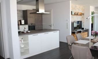 Neue, luxuriöse und moderne Penthousewohnung, Bad mit Regendusche, WC, Waschmaschine, Trockner, sep. WC, großzügiger Wohnbereich mit Küche, Kaffeevollautomat, Spülmaschine, Backofen, Mikrowelle, heller gemütlicher Essbereich, Wohnbereich mit hochwertiger Schlafcouch für 2 Personen, Flachbildschirm, Balkon mit Blick ins Grüne, Schlafzimmer mit Boxspringbett und zweitem Flachbildfernseher sowie Sekretär und begehbarem Kleiderschrank.