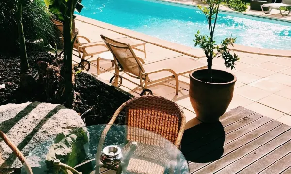 Der beheizte Pool des Hotels La Chaumette befindet sich im Garten und ist von einer möblierten Sonnenterrasse umgeben. Im Garten befinden sich auch ein Essbereich und ein Kinderspielplatz.