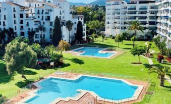 Recently renovated urbanization with access through Andalusian patios with fountains and plants. The apartment is a fourth floor apartment with a lot of light and a window that overlooks Avenida José Banús: Paseo de las Estrellas and a balcony from where you can see the sea. A bedroom that overlooks a courtyard with a two-metre bed and an extra bed and a large wardrobe. New open kitchen with a bar to the living room. A dressing room leads to the newly renovated bathroom and a large bedroom with a double bed, a mirror mural, a balcony and a large wardrobe with two doors and a mirror.About pets:No pets allowed.About children:Children allowed: ages 0-17.About smoking:Smoking is not permitted.About events:No events allowed.