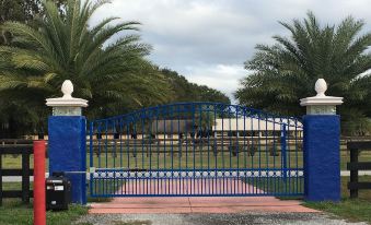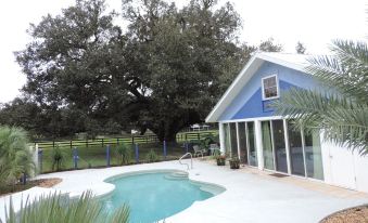 Imagine waking up in the midst of Ocala's horse country, hearing the birds, watching nearby ponies, and having your coffee poolside, steps from the centuries-old oak tree. No neighbors. Your own parking space and walkway. This is a special hideaway for two, just 20 minutes from downtown Ocala and 30 from Gainesville and University of Florida. Architect designed, spiral staircase leads to spacious loft bedroom with queen bed, sitting area, and library; windows overlook horses, meadows, trees. Ground floor has glass walls on three sides with full-length drapes for complete privacy. open concept living/dining room with compact kitchenette is perfect for relaxing and meals. High speed internet, TV. Poolside patio includes BBQ grill, glass table and chairs. Kidney shaped pool surrounded with palms is fenced and pet friendly. Grassed dog yard is accessible from dining room, plus you can walk for miles on the surrounding streets and farm lanes. Perfect for relaxing and letting your worries slide away.About pets:Pets allowed.List pets when booking.About checkOut:Check out before 11:00 AM.About children:Children allowed: ages 0-17.12+ years old.About customRules:No bleach allowed because of septic tank system.Clean up after dogs in yard. Shot, vet and parasite records required upon request.,No harassment of any animals on farm or neighbors by dogs or people. Dogs off leash by permission of Owner only.About checkIn:Check in after 3:00 PM.About smoking:Smoking is not permitted.About minBookingAge:Minimum age to rent: 25.About events:No events allowed.