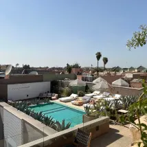 Very nice place to stay; we had 2 deluxe rooms for 3 nights. Very Moraccon with beautiful interior garden. Clean, very quiet. We had a courtesy welcome tea and orientation by hotel staff - they were friendly and helpful throughout. Be aware that is is located well off the street - several turns down alleys to find it - but staff met you at street drop off and carried bags both ways for you. We were on first floor, but many rooms are up stairs that are circular with no handrails - no elevator on premises. Pool is on rooftop 3 stories up - quite small and maybe 2 ft deep but refreshing. You also have the option to have breakfast on a rooftop - breakfast was good with option to order eggs. We did not eat dinner on site but rather went to a very nearby rooftop "Mexican" restaurant. I would recommend it for a true "Riad" style hotel.