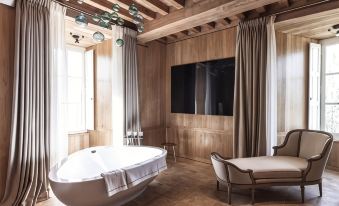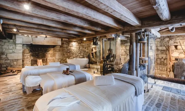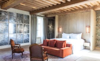 Le cadre est simplement somptueux. L'art, l'architecture, la nature... Le combo parfait pour ce domaine qui possède un énorme potentiel, malheureusement non exploité à sa juste valeur. Concernant l'hostellerie, réputée 5 étoiles. Les junior suites, aux noms des saisons, sont spacieuses mais fort mal insonorisées. Par ailleurs, de part la disposition et l'architecture de l'établissement, la connexion wifi est plus que laborieuse voire inefficiente. Elles sont dotées d'une kitchenette (plaques de cuisson, four micro ondes, évier, lave vaisselle) dont il est difficile de comprendre la légitimité. Un frigo, à disposition, fait office de mini bar; simplement pourvu de 2 bouteilles d'eau plate et 2 bouteilles d'eau gazeuse, il fait pâle figure. Il gagnerait à être doté comme un authentique mini bar. Il faut par ailleurs quémander son réassort. Concernant le spa, situé dans le Moulin, à quelques pas du Château. Là-aussi, on ne peut que souligner la qualité de la restauration et de la décoration du lieu, propice à la détente et à la relaxation. L'accueil et la prise en charge par les praticiennes sont personnalisés et attentionnés. Vestiaires avec douches et toilettes, petites cabines fermées pour y déposer ces effets personnels, salle de relaxation et peignoirs, tout y est. Le soin choisi de 90 minutes est un moment de pure détente. L'eau de carottes après le soin est la bienvenue. Concernant les équipements de l'hôtel. A disposition en accès libre: - des vélos, - deux barques pour une balade sur l'étang afin de profiter d'une autre perspective du domaine, - une aire de jeux, pour petits et grands, - une salle de sport, - une piscine extérieure, - un cours de tennis flottant, - des thermes dotés d'une piscine chauffée à 35° (avec de multiples jets massants), de cabines proposant différentes températures: un espace de quiétude destiné au ressourcement, - une immense salle de jeux au dernier étage du château. Impressionnante par son cachet et par les trésors qu'elle recèle... Une visite du potager en permaculture s'impose, tout comme de belles balades au sein du domaine, parsemé d'œuvres d'arts à découvrir et de belles métairies disséminées ça et là... Un passage dans l'ancienne laiterie, transformée en musée, et dotée de deux magnifiques bibliothèques. Et bien sûr, une incursion dans les salons du château! Moultes activités en perspective ! Concernant la restauration. Le petit-déjeuner est somme toute très classique. Buffet continental avec machines à café, thés en sachets... Le Restaurant Les Dyades propose quant à lui diverses formules pour le déjeuner et le dîner. Les propositions du dîner, en plusieurs services, sont audacieuses, peut-être un peu trop car, à l'originalité des mets viennent se heurter les imprécisions des assaisonnements. L'exécution des plats méritent davantage de précisions et de rigueur. Tout comme le personnel dans son ensemble. De la réception, au personnel de chambre et au personnel du restaurant. Manque de rig
