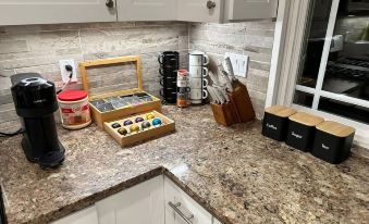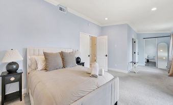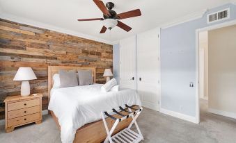 - Luxury Master Suite – Featuring a plush queen bed, private en-suite bath, and a spacious extended deck overlooking the front yard, perfect for enjoying your morning coffee or unwinding at sunset. To enhance your stay, we’ve provided luxurious tub salts and candles, turning your evening soak into a true spa-like experience.