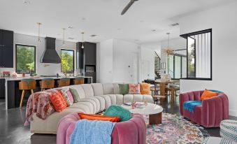 Inside, the vibrant and stylish living area features designer furniture, colorful accents, and a cozy gas fireplace beneath a massive 100' smart TV with top of the line sound bar and subwoofer for immersive sound. The open layout connects to a gourmet dining space, while large windows frame views of the lush outdoors.