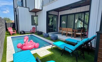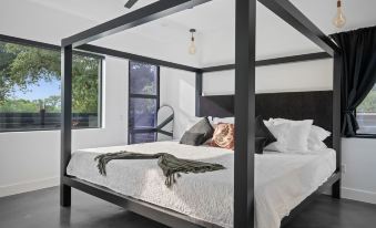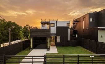 Modern East Austin retreat on the Colorado River with skyline views, 3 rooftop decks, and a private pool. Sleeps 18 with luxe king beds, including a 9’x9’ Alaskan king and a triple California king bunk bed. Just 7 minutes by Uber to downtown restaurants and bars, and only 6 minutes to the airport, this home is perfectly positioned for both convenience and serenity.
