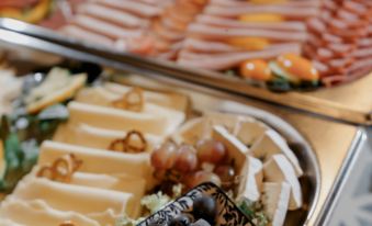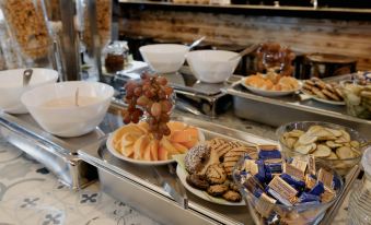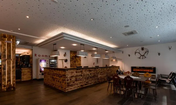Ein Frühstücksbuffet, eine Auswahl an Bier und kalte alkoholfreie Getränke sind in der Lobby im typisch bayerischen Stil erhältlich.
