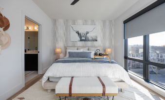 In the main living areas of Slate, designer touches harmonize with convenience. Floor-to-ceiling windows bathe the space in natural light, creating an inviting atmosphere. Comfortable furnishings invite relaxation, and a smart TV provides entertainment. The private balcony extends your living space and serves as the perfect starting point for your Nashville adventures.