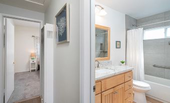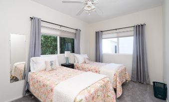 The first bedroom in the front of the home, off the kitchen, has a queen bed, a dresser, closest space, and plenty of natural light. Down the hall past the kitchen are 2 full bathrooms, one with a tub/shower combination, the other with a shower. You will also find the remaining 3 bedrooms down the hall, all with queen beds and closet space. The back 2 bedrooms can be accessed from inside the home, but also have exterior doors leading out to the walk way between the front unit and the garage.