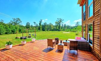 Unwind on this unique 8 acre property complete with lots of outdoor activities. All custom Cedar Cabin perfect for a getaway features modern stylings coupled with rustic materials. Lots of outdoor seating with large fire pit and seating. Located only 1.5 miles from the largest lake in Texas, water sports recreations, fishing and hunting are all on the to do lists here. Welcome to Cabins on Toledo Bend.About pets:No pets allowed.About checkOut:Check out before 11:00 AM.About children:Children allowed: ages 0-17.About checkIn:Check in after 4:00 PM.About smoking:Smoking is not permitted.About minBookingAge:Minimum age to rent: 21.About events:Events allowed: family gatherings and birthday parties.Maximum event attendees: 30.