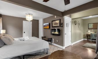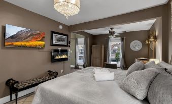 Five Spacious Bedrooms: Our home accommodates a variety of group sizes and preferences. It includes three full-size bedrooms, one queen bedroom, and a grand King Suite. The King Suite offers an elevated experience with an electric fireplace, providing a cozy, romantic setting for relaxing after a day of exploration.