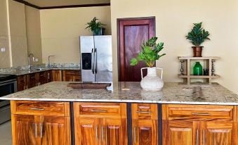 Both the incredibly large main bedroom suite and the main living space boast floor-to-ceiling panoramic ocean views across Samara beach and beyond.  Three additional bedrooms provide adequate space to accommodate large family gatherings, multiple families vacationing together, or 4 couples travelling together.  A pull out couch in the living room allows for overflow to accommodate up to ten guests in all.  Two bedrooms include en-suite bathrooms, with the other two bedrooms sharing a large bathroom right outside their door. An added guest bathroom is situated downstairs off the living room.