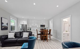 You will enter at the ground level and walk right into the open concept suite. The kitchen has a full size fridge, Keurig coffee maker, dishwasher, microwave, cooking utensils and everything needed to cook for yourself. Coffee and tea is also supplied to make your mornings bright!