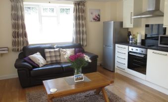 The apartments are built to high standards offering modern, contemporary furnishings including wooden floors and underfloor heating to make your stay as enjoyable as possible. The apartments are fully furnished and have free wi-fi access. The kitchens are modern with all appliances and equipment necessary if you wish to self cater. The ground floor 1 bedroom apartment has a luxurious 6' bed and quality, white linen and towels are all provided.