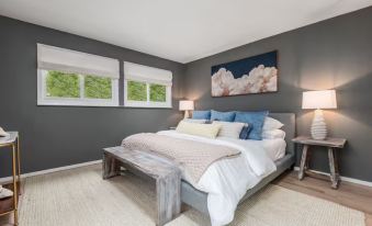 4 bd, 2.5 baths, plus outdoor/private shower. Master bed with king bed and en-suite bath. 3 bedrooms (two queen and one full). Guest bath with shower, powder room. Newly renovated and beautifully designed.