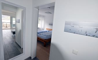 You can expect a spacious dining and living room area with media wall and a high-quality Brühl designer couch and sofa bed. The bedroom consists of a double bed (1.80 x 2 m) with high quality comfort mattresses.