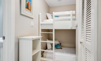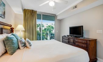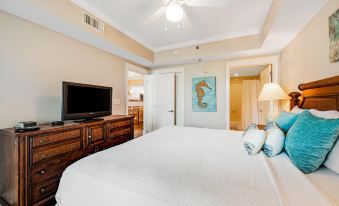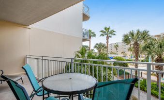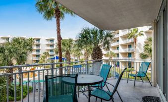 This beautiful home has a wonderful view of Waterscape's tropical garden and oasis and a partial view of the Gulf of Mexico. The primary bedroom and living room open up to a spacious balcony with outdoor seating. The condo's kitchen is well appointed with granite countertops, stainless steel appliances, and beautifully tiled floors. All dishes, cooking utensils, and bake ware are provided to complete and serve meals. There is a large square table with glass in the dining area with seating for five. This lovely home offers a twin bunk area, full bath with a stand-up shower, and a washer/dryer off of the kitchen. The open living room houses a queen sofa bed, TV, and DVD player. The primary bedroom features a king bed, private bath with stand up shower and garden tub, TV, DVD player, and walk-in closet. This condo is decorated with tropical blues and greens and reflects beach comfort and charm.