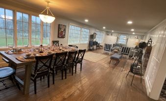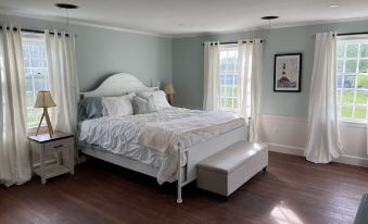 For dining, there are many seating options. The inside farmhouse table extends and seats up to 12. Two other tables are also available. In the sunroom and outdoor patio seating allow for up to 8 additional guests each. Enjoy the spectacular sunsets from the lounge chairs on the deck or the Adirondack chairs on the lawn. A large new BBQ with side burners is also provided. At night under the stars, sit around the fire pit roasting marshmallows and making s’mores.