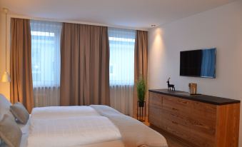 The spacious and bright apartment for 4 people (approx. 90 m²) consists of two separate bedrooms, each with a double bed, two separate bathrooms with toilet and shower, an equipped kitchen with dishwasher and oven, a living room with couch and corner bench, two 42 ' 'LED color TV with satellite reception, free WIFI, a sunny south-facing balcony with a view of the Dolomites and the village square "Raetia".