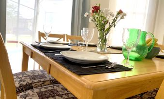The fully equipped kitchen is perfect for home cooking, with a high-top table that seats eight. A separate utility room includes a washer, dryer, ironing board, and iron, and an additional family bathroom provides added convenience. The garage has been converted into a game room, complete with a foosball table, pool table, and dartboard.
