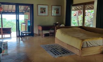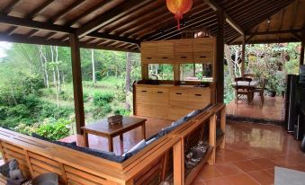One living room facing both the South/view over Yogyakarta and the central garden, full of natural light, with an extra queen-sized bed. The living room is blessed with a panoramic terrace facing the South, and the Boyong river valley.