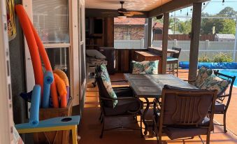 We stayed here for just over a week while we had a several day baseball tournament. Each night we would drive through the neighborhood to get to the house, but once you went out back to sit poolside you could easily forget you were in a neighborhood. You have the outside tv to watch while you swim in the pool, once the sun goes down you have the outside lights that make you feel like you’re off on a private resort. The beds were more comfortable than we could have imagined. For once we stayed somewhere in FL where the water didn’t taste like Florida water. We would definitely stay here again when we’re back in the area for baseball or visiting family. You’re close to Wal-mart, Target, grocery stores and several places to eat. 10/10 would highly recommend….. except in July, because we will need it.