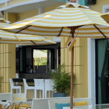 Dies ist ein hübsches, vierstöckiges, hellblaues Hotel direkt am Strand. Alle Angestellten waren freundlich und zuvorkommend.