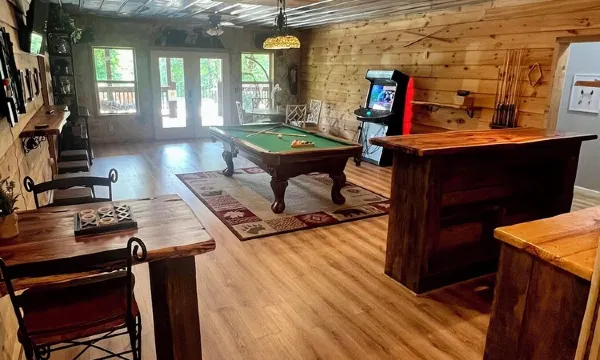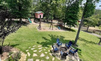Enjoy a stroll down to the creek, cast a line in the large stocked pond, or unwind by the private pool. Kids will love the playground, while the whole group can enjoy evenings by the fire pit, friendly competition in the game room, or movie nights in the cozy theater room.
